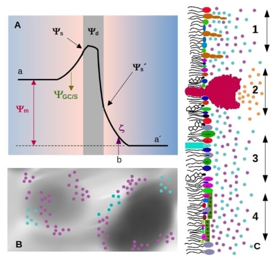 Surface charge density can be studied by means of electrophoretic mobility, which gives information about electrostatics at the hydrodynamic plane of shear (slipping plane, SP). This plane is located at a distance from the membrane surface, marked as b in Figure 1A). The potential at this point is called zeta-potential (), and depends on , the drop in electrostatic potential due to adsorbed ions (Stern model), and screening by the ion cloud (Gouy-Chapman model).