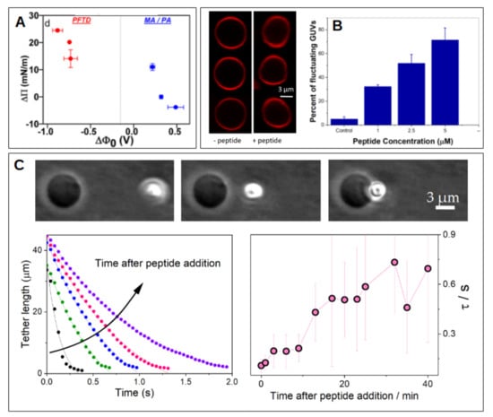 Peptide-membrane interaction. (A) Interaction of cationic peptides with lipid monolayers composed of fatty acids. The incorporation (measured as an increase in lateral pressure ) depends on the monolayer dipole potential (), and is maximal for systems with inverted (negative) values. Measurements were performed using perfluorotetradecanoic acid (PFTD), myristic acid (MA) or palmitic acid (PA). The plot is adapted with permission from [78]. Copyright (2018) American Chemical Society. (B) Shape fluctuations of GUVs in the presence of increasing concentration of a cationic peptide. Adapted from [82]. (C) Kinetic of membrane nanotube retraction formed from a GUV by means of optical tweezers. The effect of peptide addition is shown at different times. Adapted from [84] with permision from Elsevier. Copyright Elsevier (2021).