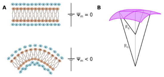 where is the bending rigidity, and are the two principal membrane curvatures, with and (being and the two principal radii of curvature schematized in Figure 3B); f is the flexoelectric coefficient, defined positive if the polarization points outwards the membrane curvature. f is mainly determined by and [110,112]. is the transmembrane electric field, which can be applied externally or can be a consequence of the local distribution of charges. As pointed out previously, spontaneous curvature arises if there is charge asymmetry between membrane surfaces, due to either unequal charged lipid composition in each hemilayer, or ion gradient generated between both ionic diffuse layers. This gives rise to an imbalance in surface pressure (tension) between the two interfaces, producing an emergent curvature [109,116]. In the case of uniformly charged symmetric membranes, instability with respect to a spherical deformation has been proposed for highly charged membranes [117]. This explains the process of spontaneous vesiculation of ionizable membranes upon pH changes. Related to this, changes in the pH (and local dielectric constant) close to the polar headgroups have been reported to depend on the curvature for inverse micelles, and also on the internal leaflet (negative curvature) of anionic liposomes [118]. Interesting, no variation in the local pH with curvature was detected in the external leaflet of the liposomes or in micelles (non-inverted). Therefore, the nature of interfacial curvature geometry and its magnitude contributes to the pH-deviation from the bulk phase to the interface [118].