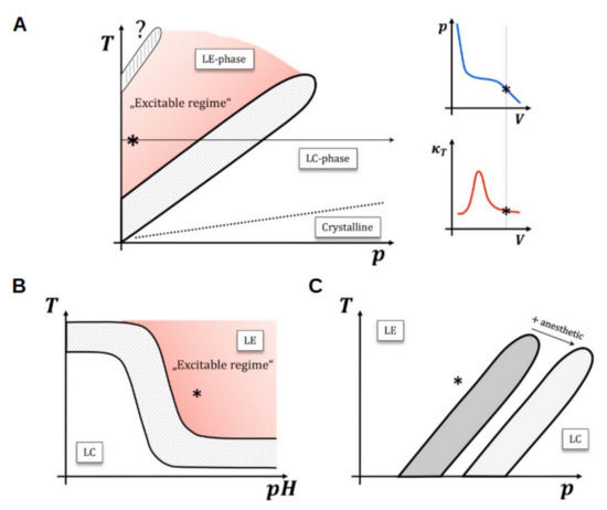 - Fillafer, C.; Paeger, A.; Schneider, M.F. The living state: How cellular excitability is controlled by the thermodynamic state of the membrane. Prog. Biophys. Mol. Biol. 2020, 162, 57–68. [Google Scholar] [CrossRef]