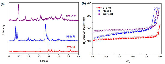 (a) PXRD and (b) N2 physisorption (77 K) for ETS-10, PS-MFI and SAPO-34.