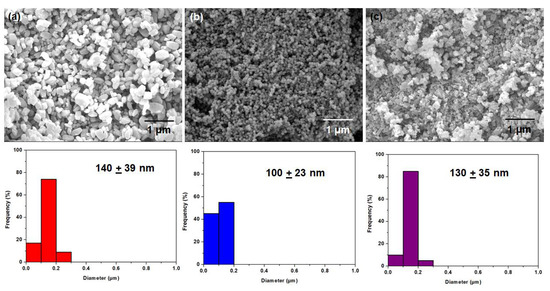 FESEM images of (a–c) ETS-10; PS-MFI and SAPO-34. Distribution of particle size was illustrated with the use of histogram.