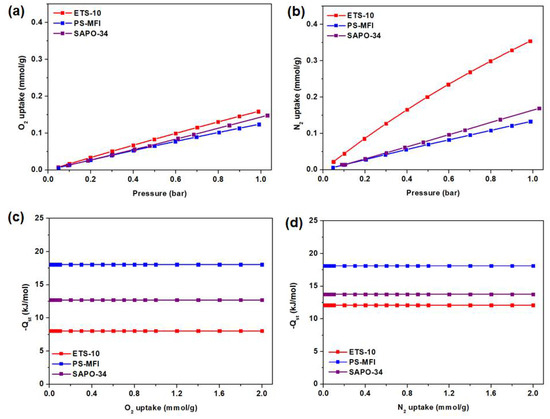 (a,b) O2 and N2 adsorption at 35 °C; (c,d) isosteric heat of adsorption (-Qst) of O2 and N2 for zeolite nanocrystals.
