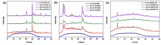 With the successful preparation of zeolite nanocrystals, mixed-matrix membrane precursors were developed next. First, thermal stabilities of zeolite nanocrystals were determined to verify that the carbonization temperature set in this work (550 °C) is appropriate. Based on the profile in Figure S2, a substantial weight loss was not observed across all samples. The decrease in weight at initial temperatures is attributed to the evaporation of residual solvents and/or water that are present in zeolite nanocrystals. Additionally, verification of the zeolites’ crystallinity after the carbonization process was also conducted using XRD on the mixed-matrix CMSMs, as shown in Figure 4. It can be seen that the characteristic peaks of zeolite nanocrystals (with reference to Figure 1a) remain, suggesting intact crystallinity and structural integrity of the zeolite nanocrystals.