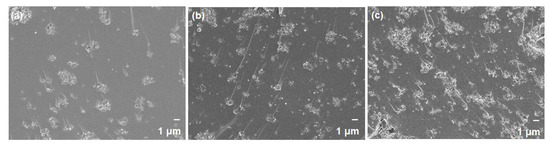 The crystallinity of zeolite nanocrystals that were developed in this work was verified via XRD diffraction (Figure 1a). The diffraction peaks are comparable with the literature data [35,36,37], indicating the successful synthesis of SAPO-34, PS-MFI and ETS-10. Subsequently, N2 physisorption at 77 K (Figure 1b) depicts a typical Type 1 isotherm across the studied zeolite nanocrystals. This is attributed to its large N2 sorption at low P/Po, indicating large micropore volumes (Table 1) [38]. Moreover, at P/Po > 0.9, the presence of unrestricted monolayer-multilayer adsorption can be seen based on the significant increase in N2 sorption at this region. Such behavior is often correlated to the plausible nanocrystal creation. This deduction is further corroborated by using visual inspection from FESEM. As illustrated in Figure 2, zeolites in nanocrystal forms were indeed successfully created. Essentially, it is recommended to utilize filler particles in nanocrystals forms in the formation of mixed-matrix membranes in order to increase the interfacial areas between the fillers and polymers. The particle size of our zeolites is estimated to be ranging between 100 and 200 nm.