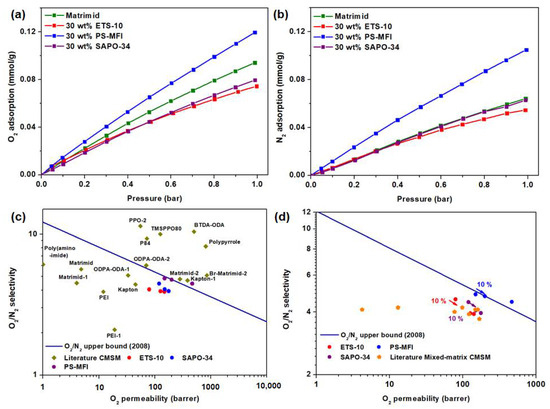 The following are available online at https://www.mdpi.com/article/10.3390/membranes11070489/s1, Figure S1: O2 and N2 adsorption of ETS-10, PS-MFI and SAPO-34 at 25 °C; Figure S2: TGA analysis of ETS-10, PS-MFI and SAPO-34; Figure S3: Dubinin–Radushkevich (DR) plot for CMSMs and mixed-matrix CMSMs: (a) Matrimid, (b) 30 wt% ETS-10, (c) 30 wt% PS-MFI, and (d) 30 wt% SAPO-34; (e) CO2 adsorption of CMSMs and mixed-matrix CMSMs at 0 °C. The saturation pressure of CO2 (denoted as Po) is set at 26,141 torr; Figure S4: Performance of mixed-matrix CMSM with Findex indicated in the figure as reference. The Findex value can be obtained from Table 2, based on the calculation from Equation (5); Table S1: Fitting parameters for O2 and N2 for ETS-10, PS-MFI and SAPO-34 at 25 °C; Table S2: Fitting parameters for O2 and N2 for ETS-10, PS-MFI and SAPO-34 at 35 °C; Table S3: Porosity properties of CMSM and mixed-matrix CMSM; Table S4: Solubility and diffusivity of O2 and N2 of CMSM and mixed-matrix CMSM at 35 °C under the feed pressure of 1 bar (0.21 bar for O2 and 0.79 bar for N2); Table S5: Performance of pure CMSMs that have been reported in the literature for O2/N2 separation; Table S6: Performance of mixed-matrix CMSMs that have been reported in the literature for O2/N2 separation.