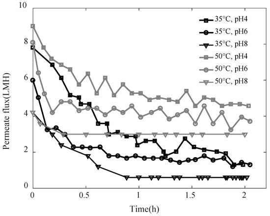The permeate flux observed during the distillation of SA-BSA solutions at different pH 4, 6, and 8, and temperatures 35 °C and 50 °C, are shown in Figure 1. For all studied conditions, the permeate flux decreased in the first phase due to the membrane fouling, then kept a constant value during a second phase until the end of the experiment, which shows that the fouling layer developed kept constant characteristics during the second phase. The fouling layer developed is mainly due to ionic interactions between alginate and BSA molecules [29]. Higher permeate flux was observed for higher temperatures. In fact, the vapor pressure difference, which is the driving force in the MD system, was higher at a higher feed solution temperature. Regardless of the feed solution temperature, lower permeate flux was observed at higher pH. While the interactions between alginate and BSA were higher at pH 4 and promoted the formation of aggregations, at pH 6 and 8, alginate-BSA soluble complexes were formed. The complexes alginate-BSA have a lower size and are more soluble as pH increases [30]. As water evaporates, soluble complexes reconcentrate in the vicinity of the membrane surface and lead to a concentration polarization phenomenon which could evolve to form a deposit by chain entanglements [29]. Thus, the fouling layer formed at higher pH would be denser, which explains the lower permeate flux observed at pH 8.