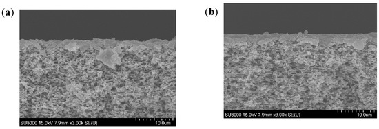 SEM images of the membrane cross-section taken for each studied case are displayed in Figure 2. In all studied conditions, the SEM images showed a deposit formed on the membrane surface which was responsible for the flux decline. The deposit layer seemed thicker at high feed temperature for all studied pH. At higher feed temperature, the higher vapor pressure difference created allowed higher convective forces able to drag higher amounts of foulants to the membrane surface. This would promote a rapid accumulation of a high amount of foulant, leading to the building of a thicker fouling layer. However, at low feed temperature, lower convective forces toward the membrane were created. Thus, the lower amount of foulants were dragged slowly towards the membrane surface, leading to the building of a thinner fouling layer. At high feed temperature, lower deposit thickness was observed when pH was increased, which could be explained by the effect of acidic conditions in promoting SA and BSA aggregation [31,32]. Nevertheless, at similar feed temperature, the opposite trend was observed by Yan et al. [23], who showed thicker deposits when increasing pH from 5 to 8. This observation was due to the effect of scaling, which was not considered in our study. The scaling occurring at high pH fosters the organic fouling, as organics could be attached to the scaling layer [23].