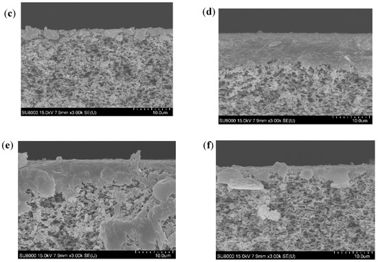 Cross-section view of the fouled membranes at different pH and temperatures (a) 35 °C, pH 4, (b) 35 °C, pH 6, (c) 35 °C, pH 8, (d) 50 °C, pH 4, (e) 50 °C, pH 6, and (f) 50 °C, pH 8.