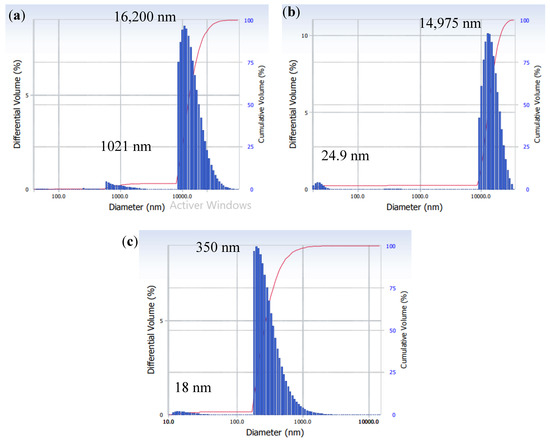 The particle size distribution is an important parameter in characterizing the fouling layer structure, as shown by the Kozeny–Carman relation (Equation (7)), which expresses the specific cake resistance in the function of the particle size. The particle size distribution in mixed SA-BSA solution obtained at pH 4, 6, and 8 is shown in Figure 3. In all three conditions, two peaks are shown, one high and one low peak. The high peak corresponds to the more dominant particle size. At pH 4, the high peak was observed at a diameter of 16,200 nm and the low peak at a diameter of 1021 nm. At pH 4, large SA-BSA complexes were formed due to the electrostatic attraction between the positively charged BSA and the negatively charged SA. Harnsilawat et al. [31] also observed large complexes with sizes superior to 1000 nm at pH 4. Moreover, around its isoelectric point (4.9), BSA tended to aggregate due to hydrophobic attraction, van der Waals attraction, or electrostatic attraction between positively charged groups in some proteins and negatively charged groups in others. Furthermore, the protonation of carboxylic groups in the alginate structure leads to the formation of alginic acids, which tend to precipitate [32,33]. In addition, entanglements between alginate and protein chains could help the formation of bigger aggregates [29,31] and this phenomenon could be enhanced by the feed solution reconcentration due to its evaporation nearby the membrane surface in the MD system.