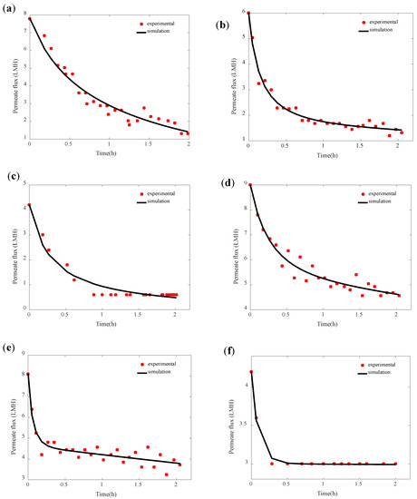 Comparison of the permeate flux experimental data and the model simulations obtained for different pH and temperatures (a) 35 °C, pH 4, (b) 35 °C, pH 6, (c) 35 °C, pH 8, (d) 50 °C, pH 4, (e) 50 °C, pH 6, and (f) 50 °C, pH 8.