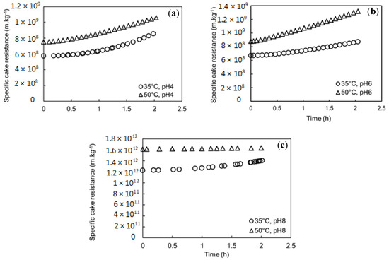 Simulations of Specific cake resistance with time at different feed temperatures and pH, (a) pH 4, (b) pH 6, and (c) pH 8.