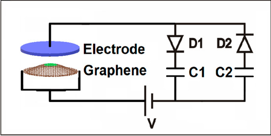 Graphene energy harvesting circuit using two diodes (D1 and D2), two storage capacitors (C1 and C2), and a rechargeable battery (V) to charge the graphene-electrode variable capacitor on the left.