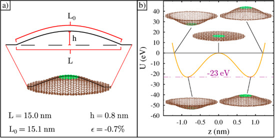 where is the central height of the ripple and and are the coordinates of the carbon atoms. As increases, the arc length in a vertical plane also increases, which stretches the bond lengths back to the original 0.140 nm and aids in the simulation’s optimization. We found that for an original planar strain of −0.7%, the relaxed height of the ripple is about 0.8 nm. An illustration of a ripple with this strain is shown in Figure 2a. An approximate formula relating the original planar percent strain to the relaxed final height in nm is given by: