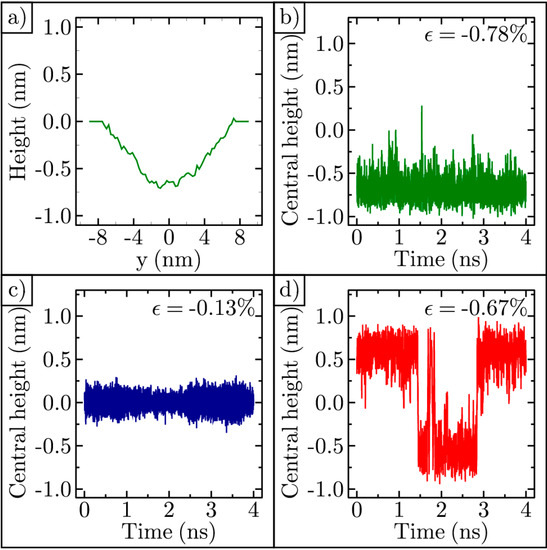 We tracked the central height of the ripple in time. One such example is shown in Figure 3b. For this ripple, the strain is −0.78%. It is trapped in a concave shape for the entire 4 ns shown. Another ripple with strain −0.13% is shown in Figure 3c. In this case, the strain is too low to be bistable at the temperature of the simulation. When the ripple strain is between these extremes, it can invert its curvature multiple times within a 4 ns time interval. One example is shown in Figure 3d. In order to test the integrity of our simulation methods, we successfully reproduced similar ripple curvature inversion results previously published [43].