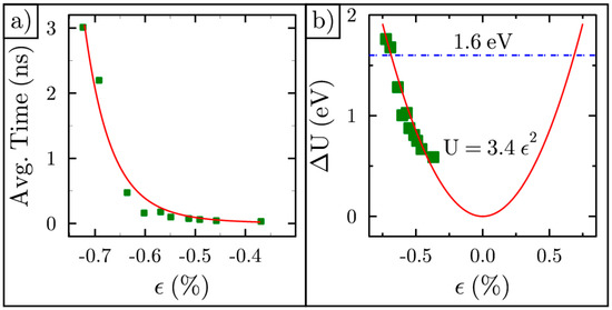 Average time and energy barrier: (a) Average time between curvature inversion vs. strain; (b) Barrier height vs. strain.