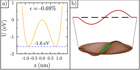 The zero Kelvin potential energy of a −0.7% strained ripple is the double-well potential, as shown in Figure 2b. The two minimums correspond to a convex- and concave-shaped ripple with equilibrium bond lengths, as also illustrated in Figure 2b. When the ripple is compressed into a flat lattice, its energy is 23 eV higher. This is the barrier height between the two minimums at zero height. If the ripple is stretched by 0.7%, starting with its relaxed cosine shape [42], its potential energy will increase by 23 eV and equal the barrier height. These five points precisely fit the double-well potential energy function given by: