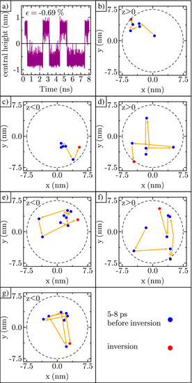 To study the shape transformations, we first identified all the inversion events in a particular ripple simulation by plotting the central height over time, as shown in Figure 6a. Root-mean-square deviation (RMSD) analysis confirms the atom positions have stabilized within the first 0.2 ns. The initial time data are not included in the plot. After stabilizing, the ripple’s height is positive in the beginning, then flips 6 times during the next 8 ns. To track the larger structure of the ripple, we also recorded the height of the ripple along both the x-axis and y-axis every picosecond. From these datasets, we determined the (x, y) coordinate for the maximum height in time. Next, for the 6 ps prior to the first ripple curvature inversion, we plotted the (x, y) coordinate of the maximum height as shown in Figure 6b. The ripple maximum begins near the center of the ripple (0,0), then shifts to the edge of the ripple just before inversion. This process of starting near the center and moving toward the edge was repeated for all the ripple curvature inversions, as shown in Figure 6c–g. Given that a large displacement of the maximum away from center and toward the edge occurs just prior to inversion for every event shown in Figure 6, we believe that this displacement triggers ripple curvature inversion.