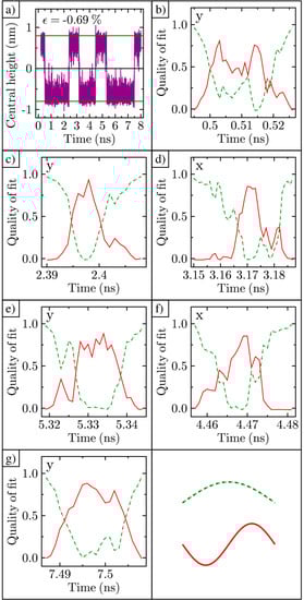 Next, we analyzed the shape of the ripple in time. This was carried out by using regression analysis on the cross-sectional datasets taken in both the x- and y-directions. For convenience, we redrew Figure 6a in Figure 7a. Cross-sectional datasets were extracted every picosecond and fit with both a cosine function with its maximum z-displacement at (0,0) and a sine function with its minimum z-displacement at (0,0). The resulting goodness-of-fit values (R2) are shown for each function in time, as the ripple inverts. Early on, the goodness-of-fit for cosine is close to one, while sine is close to zero, as shown in Figure 7b. Here, the ripple has the normal cosine shape. As time progresses, the quality of the cosine fit decreases, while the quality of the sine fit increases. Therefore, the ripple now takes on a shape more like that shown in Figure 5b. At the end of the time series, the cosine fit returns to nearly one, and the ripple has fully inverted. This sequence of shape changes, from cosine to sine and back to cosine, is repeated for all ripple inversion processes, as shown in Figure 7c–g. This change in the goodness-of-fit occurs in either the x- or y-direction; in some cases, it occurs in both directions. Only 8 ns of tracking data are shown in Figure 7a for conciseness. However, we completed the same analysis on 40 ns of data and confirmed the same correlation between the cross-sectional shape change and inversion. From these data, we believe that the shape transformation from cosine to sine, then back to cosine, is a key process for ripple curvature inversion.