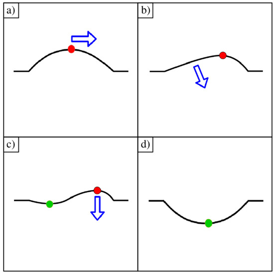 Conceptual illustration of the shape transformation through curvature inversion: (a) The maximum of the ripple moves from center to right; (b) Curvature is low on the left side. Local atoms are pulled down toward the fixed frame; (c) The left side passes through the x–y plane and the ripple forms a sine-like shape; (d) The left sub-ripple has pulled the right sub-ripple down. A single ripple is formed below the x-y plane.