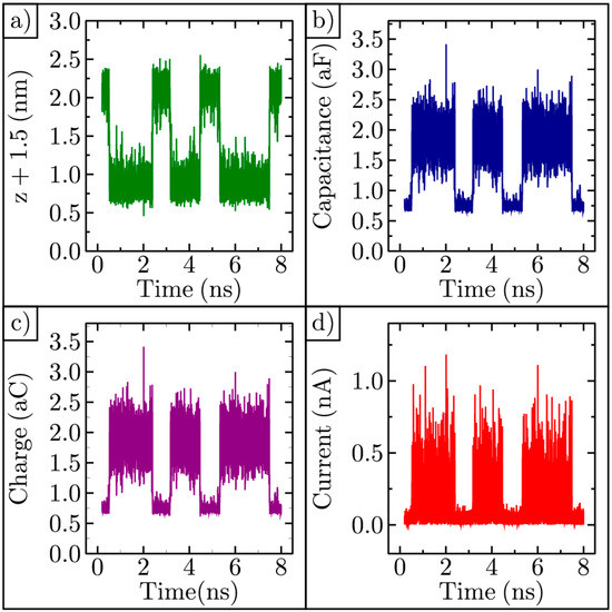 We can utilize the MDS data to predict the current produced by the thermal movement of the graphene. We imagine forming a parallel plate capacitor with a time-varying capacitance given by , where is the permittivity, is the area of the graphene, and is the height of the graphene shown in Figure 7a; the fixed frame of the graphene is placed 1.5 nm away from the upper electrode shown in Figure 1. As the graphene moves, the distance between the ripple and the electrode varies with time, as shown in Figure 9a. This distance was chosen so that the graphene does not contact the electrode. The capacitance varies with time, as shown in Figure 9b. If we set the bias voltage to 1 V, then the charge, , on the capacitor will also vary in time, as shown in Figure 9c. The rectified current varies with time, as shown in Figure 9d. Here, the current flowing is on the order of a nanoamp.