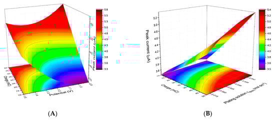 The relationship between the variables listed above and the geometry of the germanium peak (peak current, Ip, and half-width peak potential, w1/2) was studied using contour and response surface plots. As shown in Figure 2A,B, the highest germanium signal was achieved when the investigated value of the plating potential was −0.9 V and the other variables had a maximum value (50 mC for an electrode with an area of 7.07 mm2 and a Bi(III) ion concentration of 0.04 M). The narrowest germanium peaks were observed when the largest charge and the highest concentration of the plating solution were applied simultaneously (Figure 2C). When testing the influence of plating potential on the half-width peak potential, a more complex interdependence was revealed (Figure 2D). When analyzing the curvature of the surface plot, two main trends can be distinguished: (1) for a given potential value, the half-width peak potential decreased with increasing plating charge and (2) for a given charge, the minimum of the w1/2 = f (Eplat) curve was within the range of −1.2 to −1.4 V. For 50 mC, i.e., the value that yielded the highest peak current, the difference between the most favorable and least favorable response was only 0.003 V and the impact of plating potential on w1/2 can be considered as rather limited. Since the bismuth films obtained in the 0.04 M Bi(III) solution after electrolysis at an applied charge of 50 mC and a voltage of −0.9 V were determined to perform the best, they were selected for the subsequent, more comprehensive study.