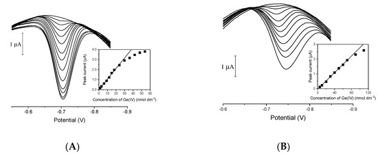 The elaborated procedure was tested using real samples spiked with 10 nM of Ge(IV). As examples, Figure 8 shows the results obtained when BiFE/SPE (Figure 8A) and BiFE/SPEmeso (Figure 8B) were applied for Ge(IV) determination in seawater via the standard additions method. The overall recovery of germanium was 9.90 to 10.4 nM.