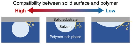 In our previous study [25], a periodic boundary condition was reasonably applied to all directions because we focused on the phenomena in the bulk of the membrane. However, to investigate the mechanism for structure formation at the surface in contact with the solid substrate, the boundary condition for the solid surface with various compatibilities for the polymer and solvent was required. Here, the compatibility was represented by contact angle θ of the polymer-rich phase in the solvent-rich phase formed by phase separation on the solid surface; the solid surface with θ < 90° or θ > 90° has a high or low compatibility with the polymer, respectively. The schematic of the contact angle is shown in Figure 1.