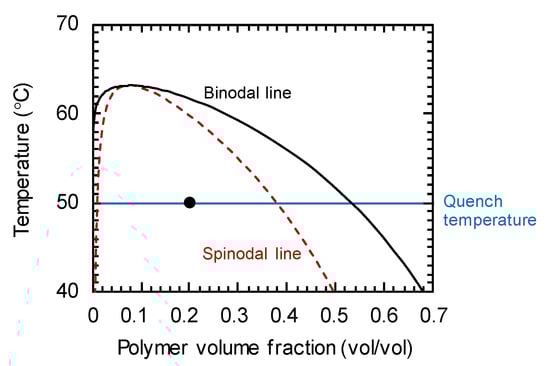 The thermally induced phase separation (TIPS) of a polymer solution is one of the major methods for preparing porous polymeric membranes [1,2,3]. In this process, a homogeneous solution of a polymer and a solvent at a high temperature is cast onto a substrate or spun in the form of a hollow fiber, and immersed in a cooling bath to induce phase separation and solidification. When the polymer solution is cooled down to a temperature below the spinodal decomposition temperature, the homogeneous solution starts to separate into two phases, that is, a polymer-rich phase and a solvent-rich phase (polymer-lean phase), which is a well-known spinodal decomposition mechanism [4]. After a certain period of phase separation, the polymer-rich phase is solidified as a membrane matrix by crystallization or glass transition, while the solvent-rich phase forms membrane pores. The resultant porous membrane can be used in various separation processes, including water treatment [5,6,7], battery separation [8,9], and membrane distillation [10,11], because of its diversified pore structure, well controlled porosity, and good mechanical property.