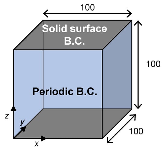 The calculations were conducted using an original program, the validity of which was demonstrated in our previous work [25]. The computational system for the TIPS simulations is illustrated in Figure 3. The dimensionless size of computational domain was Lx* × Ly* × Lz* = 100 × 100 × 100. The solid surface boundary condition, which was described in Section 2.2, was applied to the top and bottom boundaries, while the periodic boundary condition was applied to the side boundaries. The initial polymer concentration was set to ϕ(x) = ϕ0 + δϕ(x), where δϕ(x) represents an infinitesimal fluctuation of polymer concentration and was provided by a random number generation algorithm.