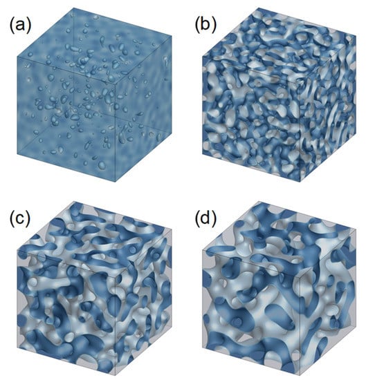 First, the evolution of membrane morphology in the bulk of the membrane, which was obtained by applying the periodic boundary condition in all directions, was calculated (Figure 4). Hereafter, in the snapshots, the isosurfaces of ϕ = 0.15 are depicted, and the blue- and gray-colored areas represent the polymer-rich and solvent-rich phases, respectively. The initial minute fluctuations in the polymer concentration rapidly generated a solvent-rich phase (Figure 4a). As the phase separation progressed, the solvent-rich phases grew and connected with each other (Figure 4b,c), resulting in the formation of bicontinuous morphology (Figure 4d). This tendency of morphological development is in good agreement with that reported in the previous results, which were obtained with an initial polymer concentration of ϕ0 = 0.30 [25].