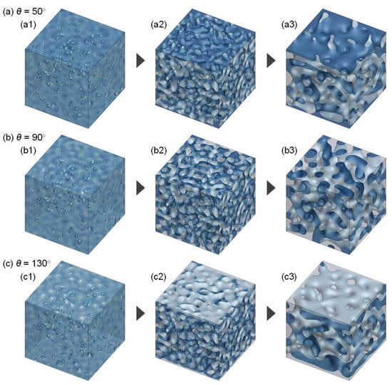 The time-course of morphology growth is shown in Figure 6 for θ = 50°, 90°, and 130°. In all cases, the structure growth in the bulk was similar to that described in Figure 4. The surface structure development, however, varied with θ. For θ = 90° (Figure 6b), the surface morphology grew in the same way as that in the bulk. Thus, the surface structure was almost identical to that of the bulk structure. At the higher compatibility between the polymer and the solid surface (θ = 50°), the membrane surface was almost covered by the polymer-rich phase after a short time (Figure 6(a2)), and the polymer-rich phase at the surface grew (Figure 6(a3)). On the other hand, at the lower compatibility between the polymer and the solid surface (θ = 130°), the solvent-rich phase concentrated quickly near the surface (Figure 6(c2)), and most of the surface area was covered by the solvent-rich phase (Figure 6(c3)).