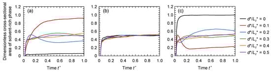 Figure 7 shows the time variations of the dimensionless cross-sectional area of the solvent-rich phase at different depths from the solid surface, d*/Lz* = 0, 0.1, 0.2, 0.3, 0.4, and 0.5, where Lz* is the height of the computational domain. Note that the lines of d = 0 represent the surface area of the solvent-rich phase, while those of d*/Lz* = 0.5 represent the area at the center of the polymer solution. When the solid substrate had similar compatibilities with the polymer-rich phase and solvent-rich phase (θ = 90°, Figure 7b), the cross-sectional area of the solvent-rich phase rarely varied at any depth position, and the cross-sectional area was almost the same even at the surface (d*/Lz* = 0). At θ = 50° (Figure 7a), the surface area of the solvent-rich phase (surface porosity) was considerably low because of the compatible polymer contact with the solid surface. The cross-sectional area just below the surface (d*/Lz* = 0.1) increased because the polymer moved to the solid surface, while the polymer concentration just below the surface decreased. In contrast, at θ = 130° (Figure 7c), the surface area of the solvent-rich phase was largest, almost equal to 1.0, suggesting full coverage of the solvent-rich phase. The cross-sectional area just below the surface (d*/Lz* = 0.1) decreased due to the decrease in solvent concentration at this position.