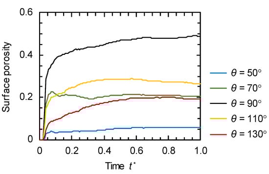 Time variations of surface porosity at θ = 50°, 70°, 90°, 110°, and 130°.