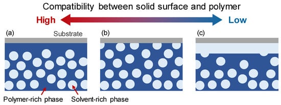 Based on the numerical results, we propose the mechanism of surface structure development, which is schematically illustrated in Figure 9. When the compatibility between the solid surface and the polymer is high, the polymer-rich phase is concentrated at the interface. Thus, the pores generated at the beginning of phase separation disappear at the surface with the progress of phase separation (Figure 6a). When the solid surface has similar compatibilities with the polymer and solvent, both the polymer and solvent are not particularly attracted to the solid surface, and the phase separation progresses in a manner similar to that inside the membrane. The pore size increases while maintaining a constant solvent-rich phase fraction at the surface (Figure 7b). When the solid surface has high compatibility with the solvent, the solvent moves to the interface; thus, the polymer-rich phase is concentrated just below the surface. As a result, the surface porosity decreases (Figure 7c) after the top layer fully covered by the solvent-rich phase is swept away. Thus, the surface porosity is highly affected by the solid surface property, and the optimal solid surface property exists to achieve high surface porosity.