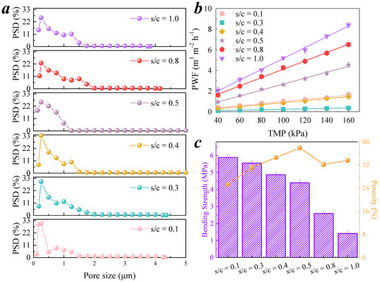 Characterization of CMs fabricated by a series of s/c ratios. (a) Pore size distribution of CMs; (b) PWF of CMs; (c) bending strength and porosity of CMs.