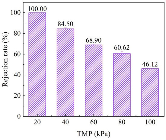 When s/c = 0.5, the membrane pore size distribution was the most uniform, the porosity was the largest, and the PWF and the mechanical strength of the membrane also showed a strong performance. In summary, s/c = 0.5 was selected as the optimal ratio for the preparation of CMs. The retention of BSA by the membrane fabricated by s/c = 0.5 at a series of trans-membrane pressures (TMP) was tested, as shown in Figure 2. The rejection rate of BSA was decreased with increasing TMP, and the retention of BSA was excellent at a low TMP. A microfiltration membrane is a low-driving pressure membrane. The PWF of the membrane fabricated at s/c = 0.5 was 2617 L m−2 h−1 bar−1, and it was large enough to filtrate at a low TMP. This result ensures the retention rate of large molecules by the CM.