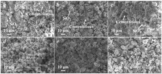 The cross-sectional morphologies of CMs fabricated with different s/c ratios could be observed by SEM. The cementitious powder was irregularly blocky, as shown in Figure S4a, and the apparent morphology of C-10 μm is shown in Figure S4b, which was regular and spherical. As it is shown in Figure 3a–f, the aggregation of C-10 μm in the cross-section of the membrane increased significantly with the increase in s/c. Calcium silicate hydrate (C-S-H) is the main hydration product of the cementitious materials, and it contributed to the strength in cementitious materials [30]. The C-S-H gel generated around C-10 μm reduced, and C-10 μm was more dispersed. Silica has pozzolanic activity. This means the active silica can react with the Ca(OH)2 in the cementitious materials to produce C-S-H [31], which can enhance the hydration reaction, generate more hydration products, induce the cement to generate a dense microstructure, and enhance the mechanical strength of the membrane. As it is shown in Figure 3a–d, a large amount of C-S-H gel was generated around the silica powder, which firmly held the silica powder [31,32]. As it is shown in Figure 3e,f, flakes and hexagonal forms of Ca(OH)2 were observed. Ca(OH)2 contributes little to the strength of the cementitious powder, which has weak interlayer linkages and is less stable. This is most often the source of crack generation in cementitious materials [31]. In addition, the CMs were mainly bonded by cementitious hydration linkages at low s/c ratios. As the C-10 μm content increased, the contact of cementitious particles became poor and was blocked by the large amount of C-10 μm, resulting in an incomplete hydration effect, which caused the mechanical strength to decrease, the porosity to increase, and the average pore size to also increase. When the content of C-10 μm continued to increase, the high pressure in the process of membrane preparation squeezed the C-10 μm tightly together. The accumulation of particles in the membrane is mainly the extrusion accumulation of C-10 μm. The particle size of the cementitious powder was larger than that of C-10 μm, and the calculated compacted C-10 μm pore was smaller than the compacted cement pore, as in Equation (1), leading to a decrease in porosity and the average pore size of CMs at a high s/c.