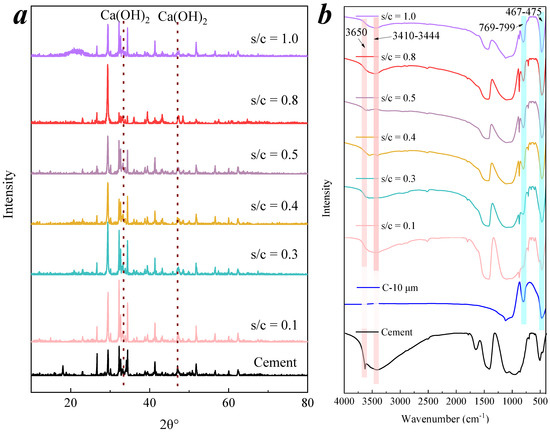 The XRD spectra of CM raw materials contained multiple chemical constituents, including calcium silicate, larnite, calcium carbonate, calcium hydroxide, and quartz, as the main composition of the cementitious powder, as shown in Figure 4a. The XRD results show that the peaks of Ca(OH)2 in CMs were all observed. This result was also embodied in the FT-IR spectra, as shown in Figure 4b. The peak at 3650 cm−1 belonged to the O–H bond of Ca(OH)2 [33]. The peaks between 769 and 799 cm−1 and 467 and 475 cm−1 are attributed to the Si–O bonds of the raw SiO2 powder. The active Si–OH can react with free calcium hydroxide to enhance the hydration of the cementitious material [34,35]. The peak at 3410–3444 cm−1 belonged to the stretching vibration and bending vibration of Si–OH or O–H of water molecules, which may be caused by surface OH or adsorbed water [36]. Hydroxyl groups on the surface of materials may be able to catalyze ozone to produce hydroxyl radicals [16].