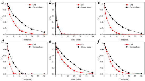 As it is shown in Figure S6, these reactions were fitted to the pseudo-first-order kinetic, and the reaction rate constants kobs were calculated, as shown in Table 3. For the six compounds, nitrobenzene, p-CA, BP-4, p-CP, p-CNB, and p-CBA, the kobs of the CM–ozone coupling process were 2.13, 0.77, 2.96, 2.57, 1.69, and 1.59 times greater than those of ozone alone, respectively. p-CA was easily degraded by ozone [37,38]. It has been reported that the other five compounds, nitrobenzene [23], BP-4 [3], p-CP [24], p-CNB [11], and p-CBA [26], are more difficult to be removed by ozone molecules alone and require catalytic ozone to generate more oxidizing radicals for degradation. These results confirm that CMs can catalyze ozone to generate free radicals [16] to degrade organic pollutants, which were not easily oxidized by ozone molecules.