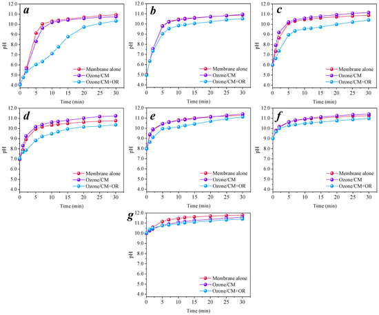 It was found that the pH of pure water increased after the membrane was introduced. For this phenomenon, the pH change trends of the solution were monitored in three processes: placing the membrane alone in pure water, which was named the membrane alone system; continuously pumping ozone into the pure water with membranes, which was named the Ozone/CM system; and adding the model pollutant nitrobenzene to the membranes with ozone coexisting in the pure water, which was named the Ozone/CM + OR system. The changes in pH in the three process solutions were measured at initial pH = 4.0, 5.0, 6.0, 7.0, 8.0, 9.0, and 10.0, as shown in Figure 6. The pH of all three systems increased with time. The pH trend of the Ozone/CM + OR system was slower than that of the system without nitrobenzene, and the pH trend of the Ozone/CM system was slower than that of the membrane alone system. This was due to the fact that the system with ozone and nitrobenzene will consume a certain amount of OH− in the solution to produce free radicals; nitrobenzene, especially, will react directly with the free radicals, which will accelerate the consumption of OH− and lead to a slower pH rise. When the nitrobenzene was completely degraded, the pH of the three systems tended to equilibrium. As it is shown in Figure 6, the initial pH of the solution had little effect on the 30 min endpoint pH of the three systems, and the final pH was in the range of 10.33–11.40, which is alkaline. It has been reported in the literature that a cement-like base material is an alkaline buffer which can stabilize the solution pH at about 10.5 after soaking for 28 days [40]. This result was confirmed by this study.