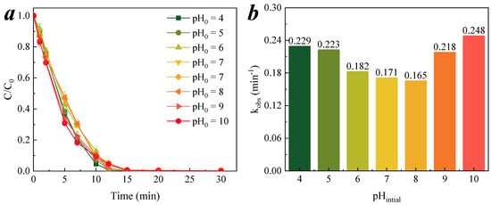 It has been reported in many studies that the pH has a significant effect on the reaction rate of oxidation and catalytic oxidation systems for the removal of organic compounds [39]. Under alkaline conditions, OH− reacts with ozone molecules in solution to form the more oxidizing OH, thus accelerating the removal efficiency of pollutants [23,39].
