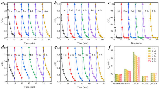 Reuse of the CM–ozone catalyst process in the degradation of organic pollutants. Degradation of (a) nitrobenzene; (b) BP-4; (c) p-CP; (d) p-CNB; and (e) p-CBA by CM-catalyzed ozonation; (f) reaction kinetics of the CM-catalyzed ozonation process. Conditions: pH = 6.9 ± 0.1, [O3] = 0.5 mg L−1, [nitrobenzene]0 = [BP-4]0 = [p-CP]0 = [p-CNB]0 = [p-CBA]0 = 0.064 mM.