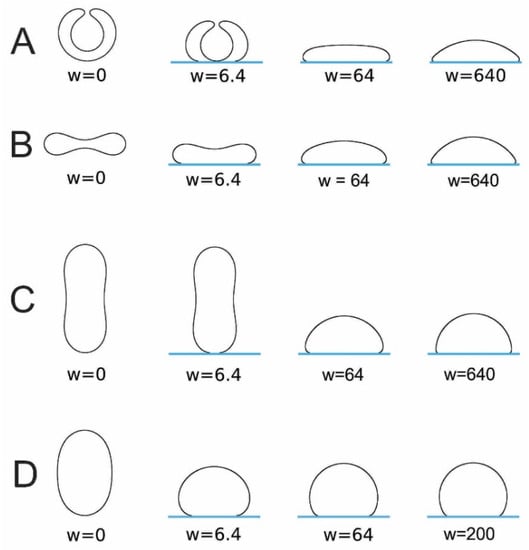 The calculated shapes of free (nonadsorbed) and adsorbed vesicles obtained by the minimization of the free energy given by Equation (18), determined for and different values of reduced volume: (A), (B), (C), and (D), and different values of reduced adhesion strength , defined by Equation (18).