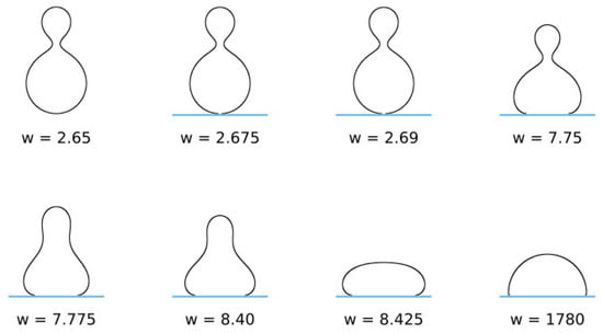 is a dimensionless parameter, where . The ratio is the reduced contact area and varies between zero for a spherical vesicle with reduced volume and for pancake-shaped vesicles for a very small reduced (zero) volume . The above energy expression (Equation (18)) is minimized numerically, as described in [133]. Note that, in Figure 12 (for ), the calculated nonadhered vesicle shapes corresponding to minimal bending energy and reduced volumes are stomatocytic, while the shapes for are oblate and, for , prolate (see also [134,135]). It can be seen in Figure 12 and Figure 13 that for high reduced adhesion strength , the calculated shapes of adhered vesicles approach the limiting shapes composed of the sections of spheres corresponding to the maximal reduced contact area at a given reduced volume .