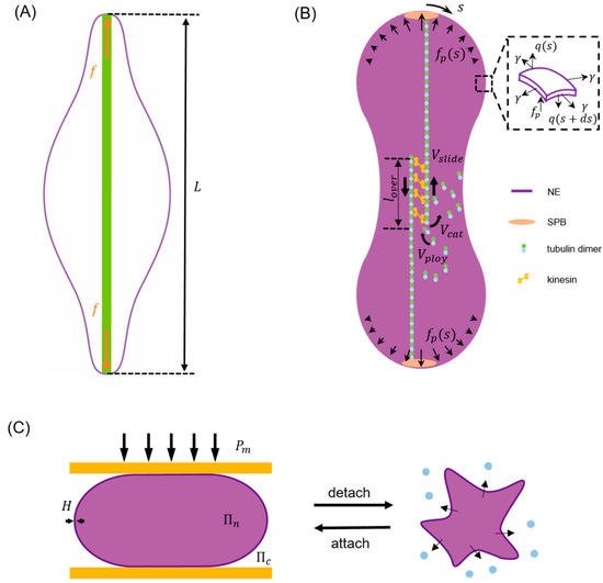 Taking closed mitosis of fission yeast as an example, since the volume enclosed by the NE remains largely as a constant [2,3] during this process a term needs to be added to the right hand side of Equation (1) with working as a Lagrange multiplier [107,109] to enforce the volume conservation condition. In addition, given that gradual separation between its two poles is driven by growing spindle microtubules inside the nucleus during closed mitosis [1,2,3,53], a corresponding potential term should also be considered. For instance, by assuming that the elongating microtubule bundles effectively generate a concentrated force on both poles (Figure 2A), a term