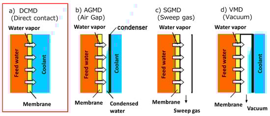 Regarding MD operation, it is important to choose the method that allows for a large vapor pressure difference across the membrane while reducing the transmembrane pressure simultaneously. MD is classified into several types based on the method of operation. Figure 1 shows the schematics of typical MD setups [19]. A direct contact MD (DCMD) (Figure 1a) is the simplest MD operation method and has been used in numerous earlier studies [10]. In DCMD, a feed water contacts with a coolant through a membrane and the pass where vapors permeate through is the shortest. Thus, the vapor flux of DCMD becomes very high. However, the heat efficiency is low because heat conduction is most likely to occur through the membrane, and temperature polarization reduces the flux [20]. By creating an air gap between the membrane and the cooling section (Figure 1b), an air gap MD (AGMD) suppresses heat conduction through the membrane [21]. Thus, the heat efficiency is higher than DCMD. However, the vapor flux is lower than that of DCMD, because of a lower vapor pressure difference. To speed up a diffusion transfer of vapor, a sweep gas MD (SGMD) (Figure 1c) and a vacuum MD (VMD) (Figure 1d) are designed [22,23]. In SGMD, a sweep gas is flowed through the air gap part, while the air gap part is decompressed in VMD. Thus, by using SGMD or VMD, it is possible to achieve both high vapor flux and low heat conduction. However, VMD requires a high vacuum, and SGMD requires a large amount of dry air to be supplied.