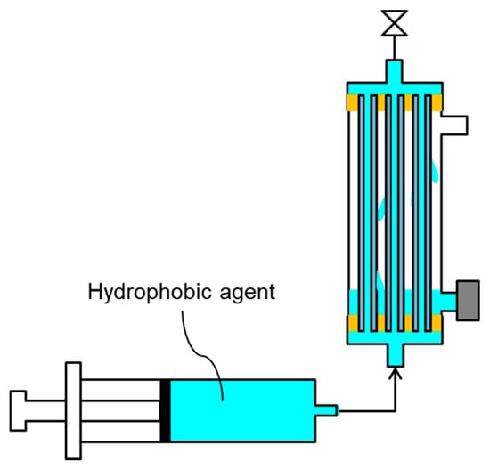 One side of the feed inlet/outlet of the module was sealed, following which a hydrophobic agent was injected by a syringe into the bore side of the hollow fiber membranes from the other side of the feed inlet/outlet of the module to wet the whole membrane (Figure 3) [18]. Before injecting, the hydrophobic agent, fluoropolymer FS-392B was concentrated up to three times using an evaporator [26]. Additionally, a permeated hydrophobic agent wet the outer surface of the HF membranes. After wetting the entire membrane, the excess hydrophobic agent was removed. Using dry air flowing into the module, the membrane was then dried overnight at a temperature of ≈25 °C to obtain a hydrophobized PVDF HF membrane module. This operation hydrophobized entire HF membrane, including the bore surface, shell surface and cross section of the membrane.