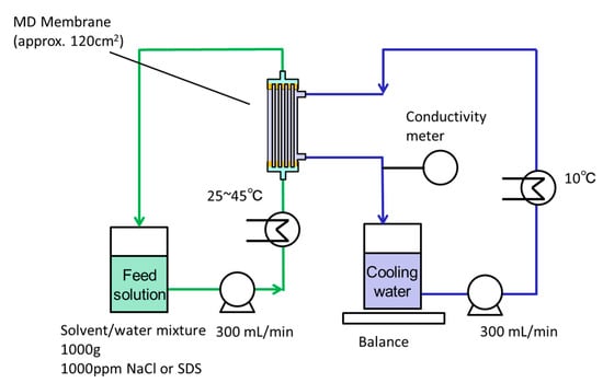 The MD performance was evaluated using the equipment shown in Figure 5 [26]. The feed organic solvent/water mixture (1000 g) was heated to the desired temperature (25–45 °C) and circulated at a flow rate of 300 mL/min to the bore side of the membrane module. The feed solution contained 1000 ppm NaCl or SDS. The temperature of the cooling water (1000 g) was lowered to <10 °C and circulated at a flow rate of 300 mL/min to the shell side of the membrane module. The higher flow rate of feed and coolant is better to acquire higher vapor flux, since the effect of heat conduction is decreased. However, an applied pressure to the inlet of the HF membrane must be increased to increase the flow rate, resulting in the increase of transmembrane pressure and the increase of risk of membrane wetting. From the balance between the merit and demerit of high flow rate, 300 mL/min in the flow rate was chosen for the feed and the coolant. The total permeate vapor flux (sum of the water and organic solvents vapor fluxes) through the membrane, (kg/m2·h) was given by Equation (3):