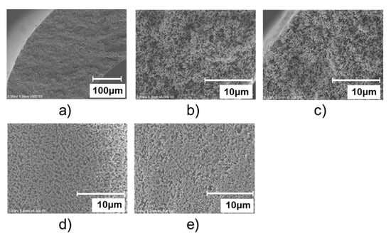 Membrane morphology. (a) Cross section, (b) Near the bore side of the cross section, (c) Near the shell side of the cross section, (d) Bore surface, (e) Shell surface.